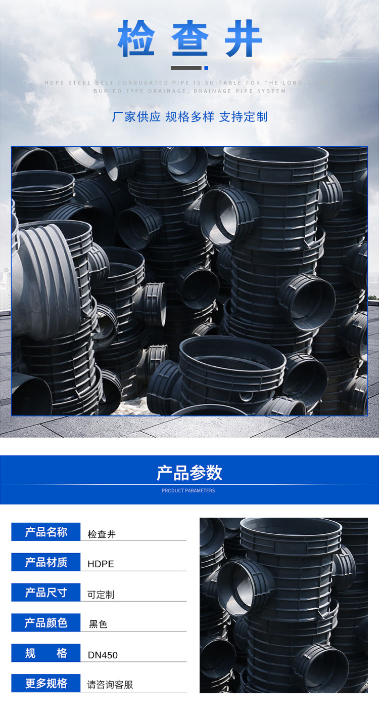 檢查井還可用于電力、光電纜、光纖和其它系統,在制作上可根據要求在任何方向非常簡單的增加新的開孔,以連接不同規格的支管。
