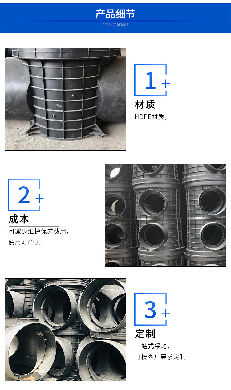 塑料檢查井又稱排水井,一般設在排水管道交匯處轉彎處、管徑或坡度改變處、跌水處以及直線管道上每隔一定距離處,是便于定期檢查、清潔和疏通管道的排水附屬構筑物。塑料檢查井以高分子樹脂為原料,采用組合結構,通常由井底座、井筒、井蓋、蓋座和混凝土支承板等組成。其中關鍵的井座部分采用一次性成型,可制造二通,三通,四通90°-165°任意交匯的所有規格檢查井,以變徑接頭、可變角接頭及密封圈等配件來達到改變管徑及角度的連接。井筒采用PE管材、波紋管或纏繞管調整井筒,可根據現場埋設深度截取相應長度,具有很大的靈活性。井筒、進(出)水管道與井座的連接采用橡膠密封圈柔性連接,可適應小范圍的內角度變化,施工方便快捷,密封性能好、永不滲漏,環保節能。
